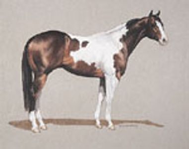 The Sabino Pinto is a dark horse with large white belly splashes which come up the sides from underneath. The belly splashes must be visible from a distance and easily seen at eye level.